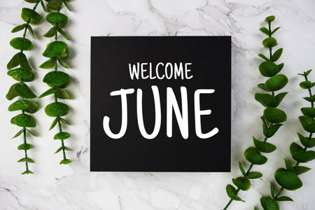 Welcome June text on paper card with eucalyptus leaf decoration top view on marble background