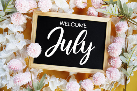 Welcome July typography text with flower border frame