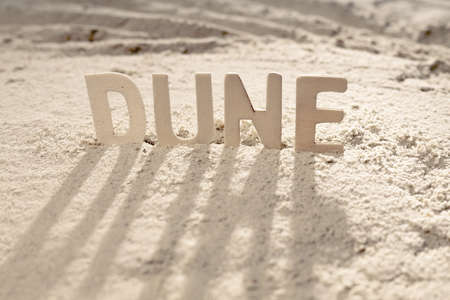 dune word casts shadow on sand, sandy surface and shadows. dune word from wooden letters