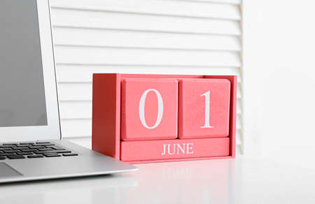 Cube calendar with date JUNE 1 and laptop on table in room, closeup