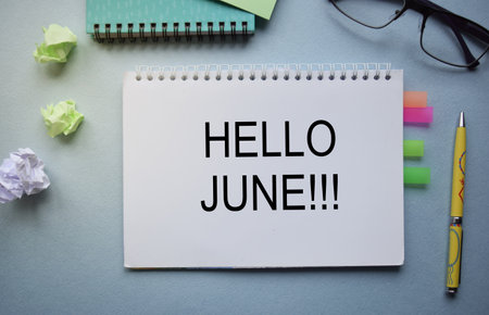 The inscription Hello june. Handwritten text in a notebook on the background of financial tables.