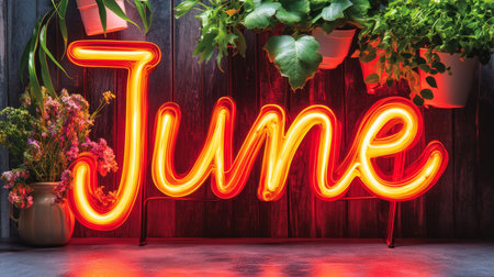 Vibrant Neon June Sign Against Dark Background With Greenery Lit With Warm Light, Summer Concept