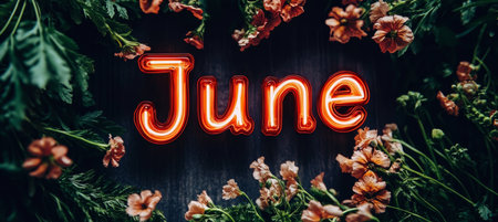 June. Neon Sign and Botanical Background with Flowers ,Vibrant Composition for Summer Season.