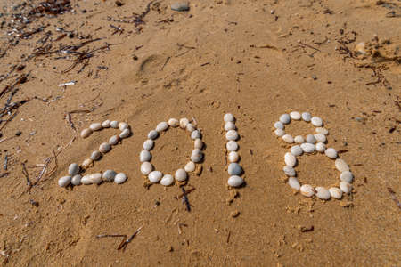 Year 2018 handwritten on seashore sand.