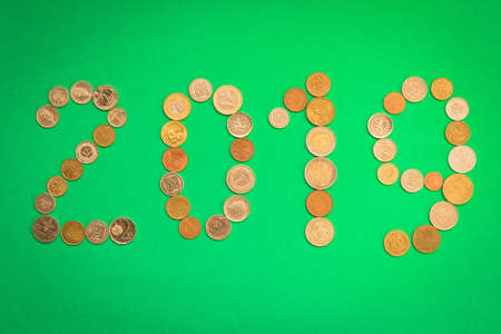 2019 is laid out of various coins on a green background. New year's eve concept.