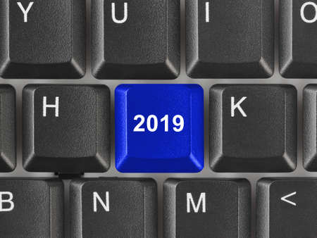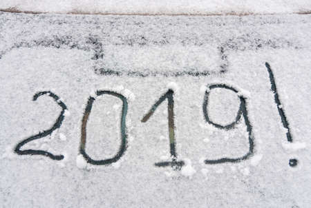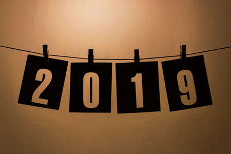 New Year concept - ‘2019’ formed on background of beach sand. With blurred vintage styled background.