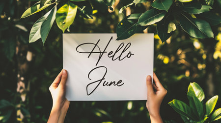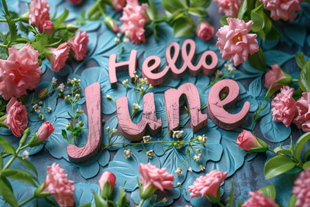 Hello June message amidst textured pink blossoms and green leaves on turquoise