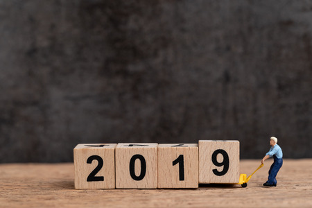 Year 2019 new year changing concept, miniature people worker using forklift moving cube wooden block building number 2019 on wood table with dark blackboard background with copy space.