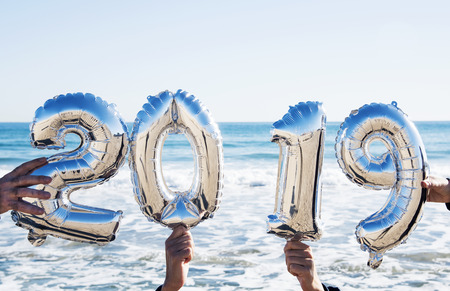 people hands outdoors holding some silvery number-shaped balloons forming the number 2019, as the new year, and the ocean in the background