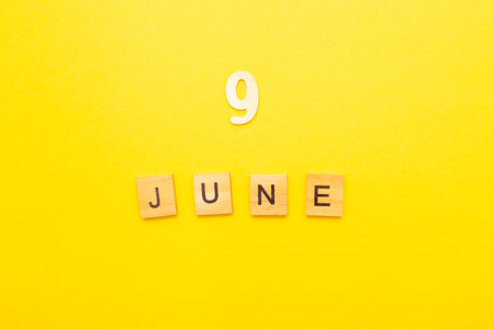 Top view of word 9 June calendar date made by wooden cubes on yellow color background