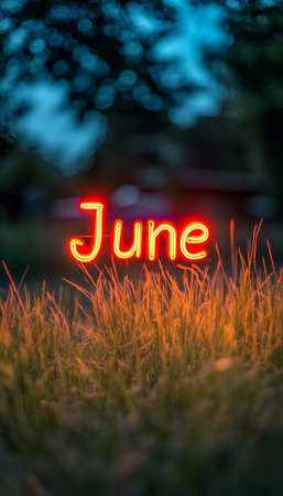 June Neon Sign in Vibrant Orange, Glowing Brightly Against a Dark, Natural Background
