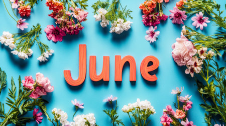 June in Full Bloom A Vibrant Flat Lay of Summer Flowers Frames the Month on Blue Background