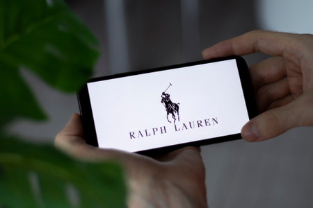 IRPEN, UKRAINE - JANUARY 20 20223, Closeup of smartphone screen Ralph Lauren lettering with in mans hands, Illustrative Editorial.