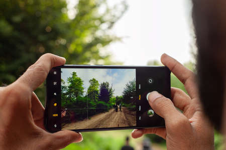 leisure, outdoor and people concept, group of friends walking on a dirt road and taking picture by smartphone on the dirt forest road