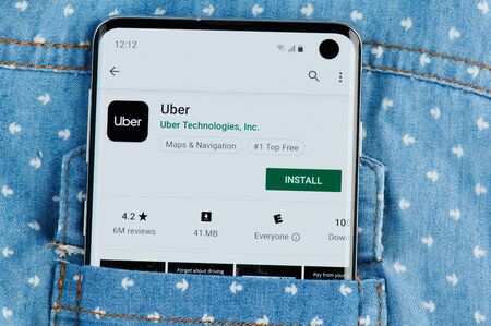 New york, USA - June 28, 2019: Uber taxi application on smartphone screen close up view in shirt pocket