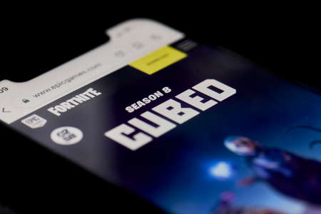 California, United States - 25 November 2021: Fortnite official website on mobile phone screen. Fortnite - Season 8, cubed. Popular online video game. Fortnite - Free-to-play Battle Royale game