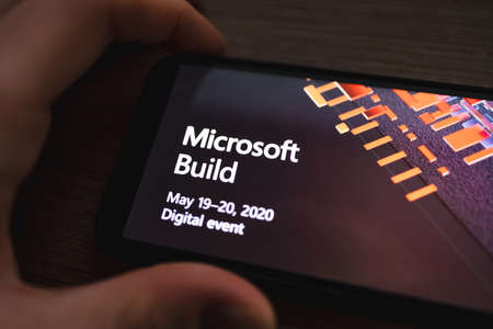 Microsoft Build online conference logo on the smartphone screen. High quality photo