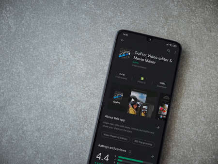 Lod, Israel - July 8, 2020: GoPro - Video Editor and Movie Maker app play store page on the display of a black mobile smartphone on ceramic stone background. Top view flat lay with copy space.