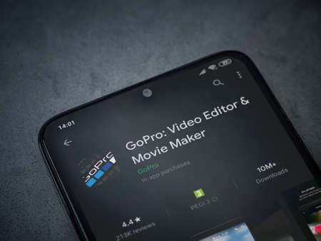 Lod, Israel - July 8, 2020: GoPro - Video Editor and Movie Maker app play store page on the display of a black mobile smartphone on a dark marble stone background. Top view flat lay with copy space.