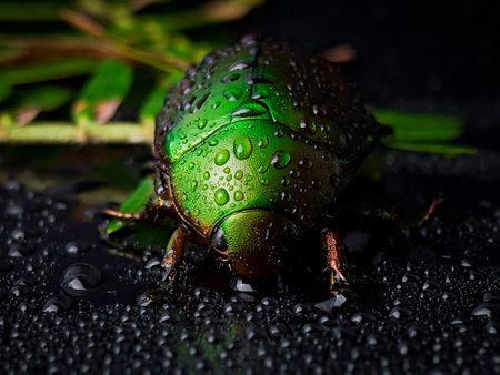 Closeup wet green beetle bug with reflection on a black background with water droplets