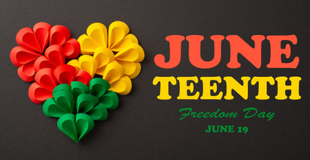 From top view, a collection of small paper hearts arranged into a large heart shape in Juneteenth's symbolic colors - red, green, yellow against a black background, offering space for social text