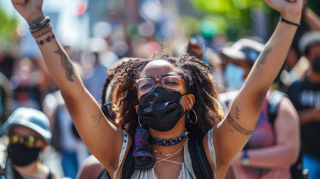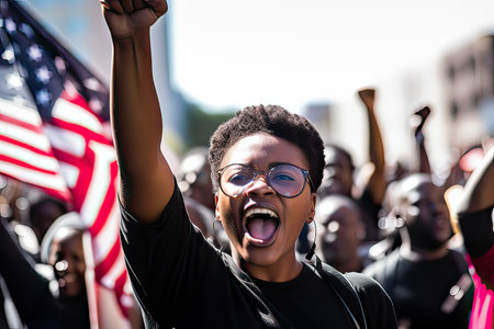 A young determined African American activist woman among the crowd, positive, proud and confident, fighting and protesting with hope racism, for rights, justice and equality, Black Lives Matter