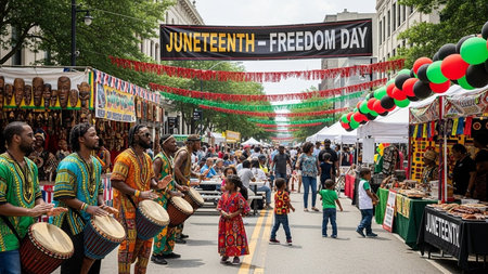 A lively Juneteenth celebration featuring traditional drummers in vibrant attire, with a bustling street fair and colorful decorations.