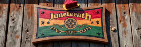Juneteenth Juneteenth sign on wooden wall with cake slice celebrating freedom and unity. That the image is generated using AI.