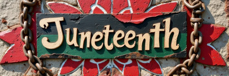 Juneteenth Juneteenth celebration sign with rustic chains and red floral background. That the image is generated using AI.