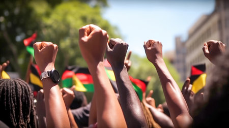 Juneteenth Freedom Day Celebration. African American people raised fists in the air. Juneteenth and african liberation day. Generative ai.