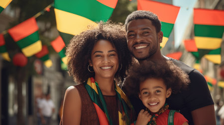 Cheerful family of three celebrating Juneteenth Freedom and African liberation day. Black life matters. Black history month