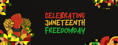 Vibrant banner for Juneteenth Freedom Day showcasing colorful geometric patterns. Ideal for greeting cards and commemorative displays.