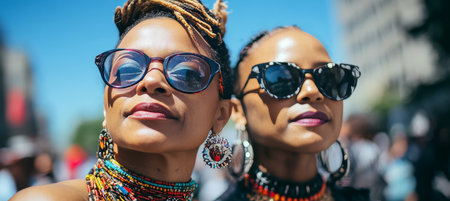 Stylish Women Wearing Trendy Eyewear and Colorful Accessories at a Vibrant Outdoor Celebration Scene