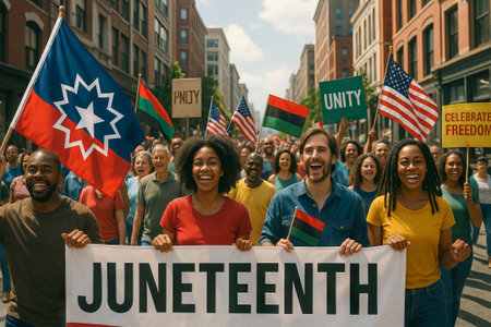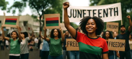 Diverse group of people celebrating juneteenth unity parade with flags and signs on a vibrant city street. concept of freedom, cultural heritage, joyful community gathering.