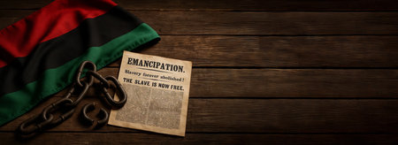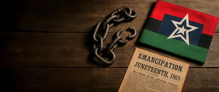 Juneteenth emancipation celebration with symbolic elements including flag, broken chains, and historical document on wooden table, background, banner, copy space.