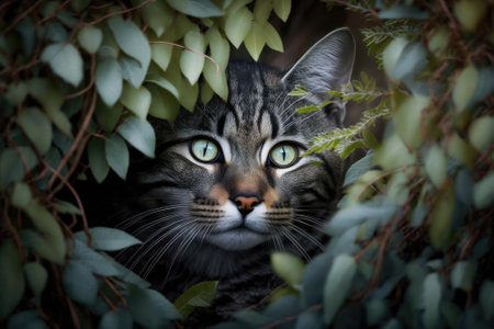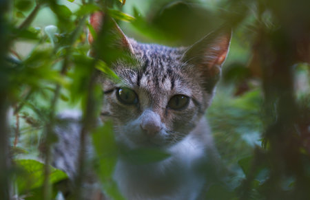 tabby young cat hides in the garden in the fresh spring tall green grass and leaves and hisses, looks frightened with big eyes