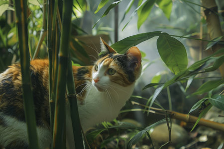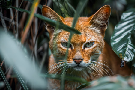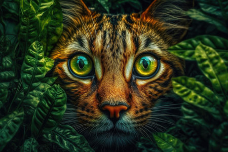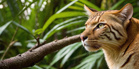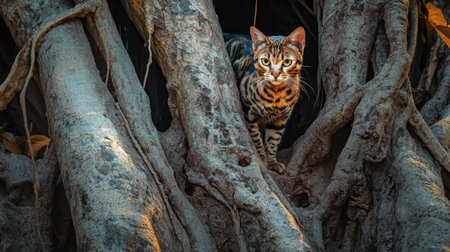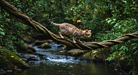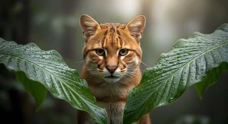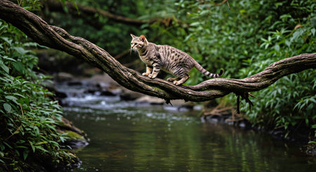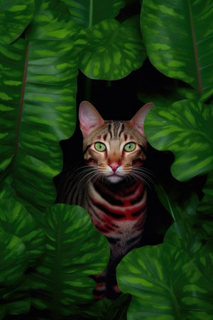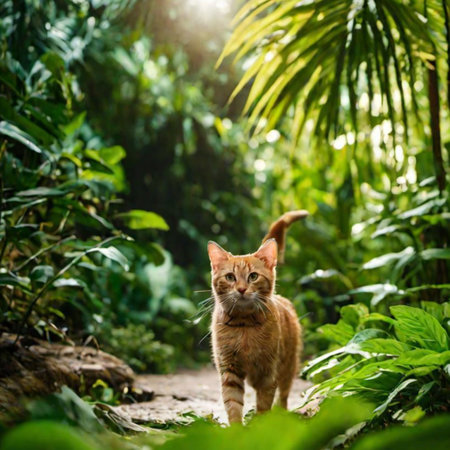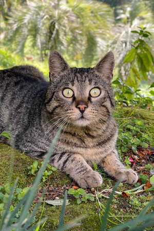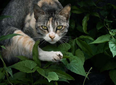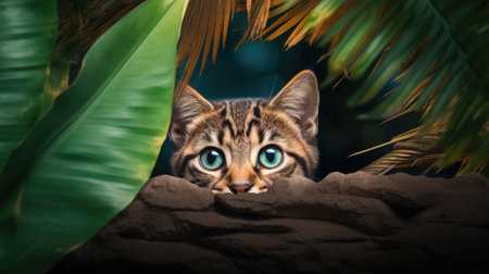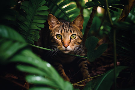 Beautiful cute cat with green eyes in the tropical mexican jungle natural forest at Santuario de los guerreros in Puerto Aventuras Quintana Roo Mexico.