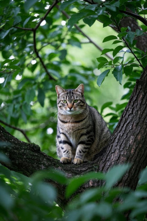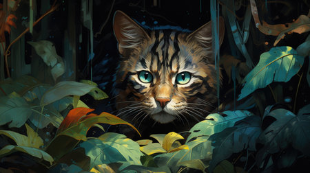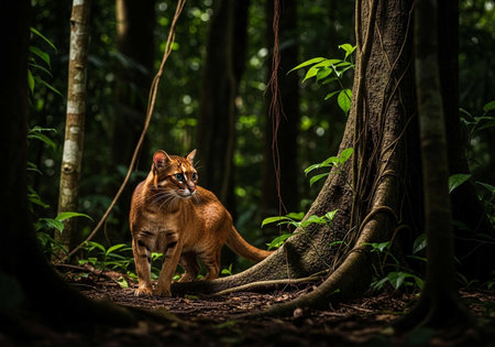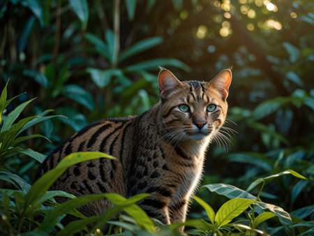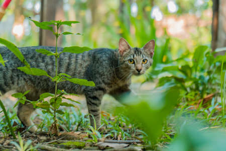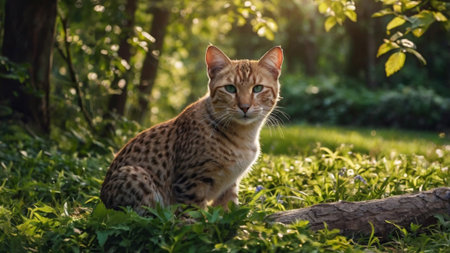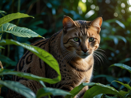 A beautiful tabby wild cat sneaks among the green grass and branches in a dark summer forest illuminated by sunlight. A pet