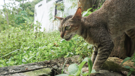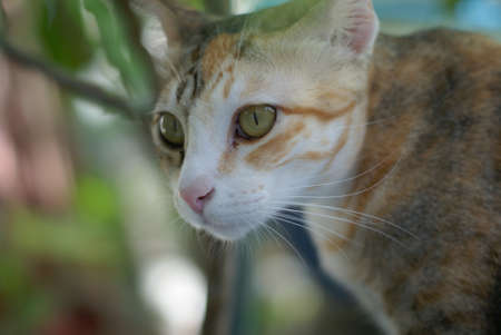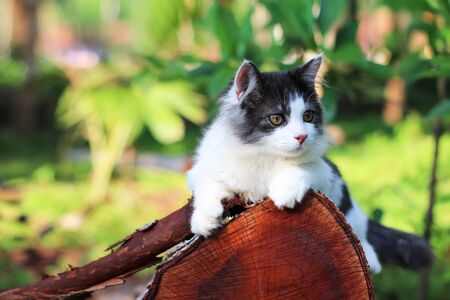 Beautiful cat playing on a wooden timber in the garden Thailand.