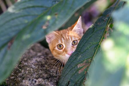 Ginger kitten iready for jumping, Cat is hidden in the grass in the garden in the garden