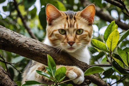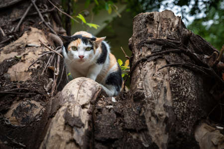 Thai cat climbs a tree. Portrait of a Thai cat in nature. A Thai-bred kitten. A lost cat with a striped muzzle. A cute tabby Thai kitten walks. A pet and nature.