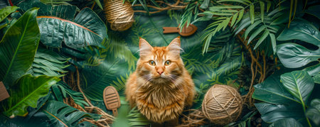 Domestic ginger cat sitting under a tropical green leaf Monstera on white background.