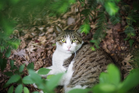 Portrait of a cute cat outdoors against natural autumn leaves backgrouud