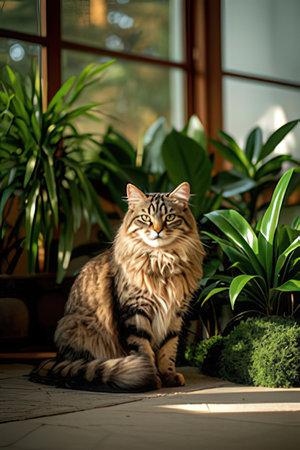 Beautiful tabby cat sitting on a window sill and looking at the camera