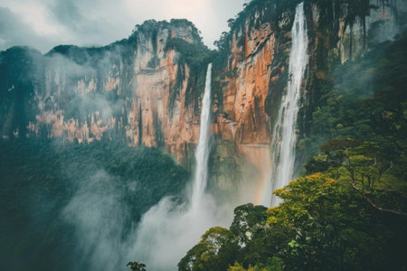 Majestic view of angel falls, the world's highest uninterrupted waterfall, in canaima national park, venezuela. surrounded by lush rainforest and dramatic cliffs, this stunning natural wonder epitomizes the beauty and grandeur of south america's landscapes.