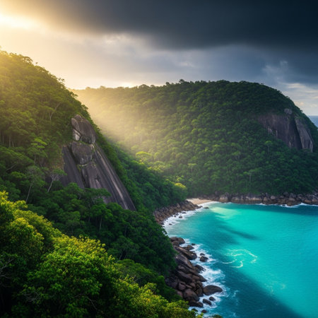 A breathtaking tropical landscape featuring majestic mountains and lush greenery, with a serene atmosphere perfect for adventure and exploration lovers.