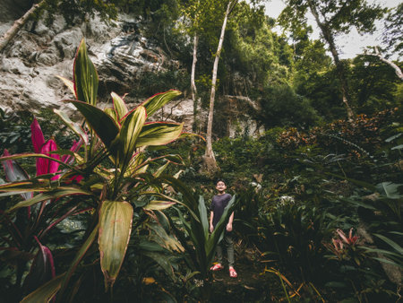 Discover the breathtaking beauty of a tropical forest featuring dense greenery and palm trees nestled within a serene mountain valley, creating a peaceful escape.