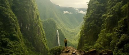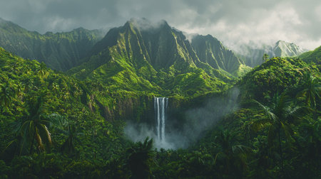 A magnificent view showcasing a lush mountain landscape with a stunning waterfall nestled among vibrant tropical vegetation and a dramatic, cloudy sky.