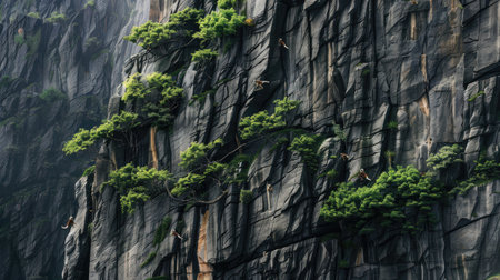 a rock wall adorned in lush green vegetation, home to a community of brown monkeys, their playful antics contrasting against the sharp corners of the rocks