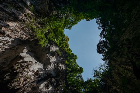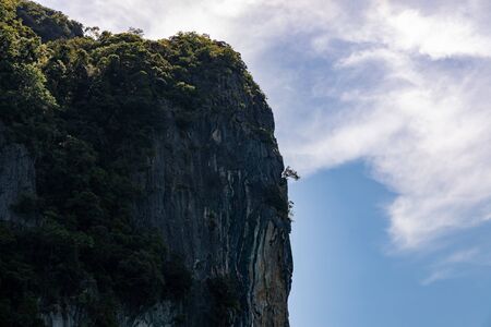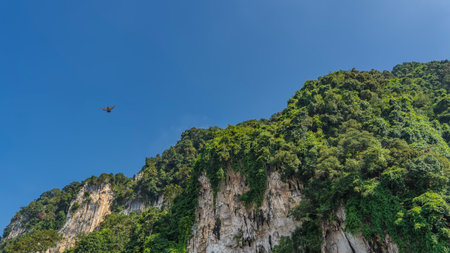 A sheer cliff with lush tropical vegetation on steep slopes. A bird in flight against a clear blue sky. Copy space. Diagonally. Malaysia. Kuala Lumpur.